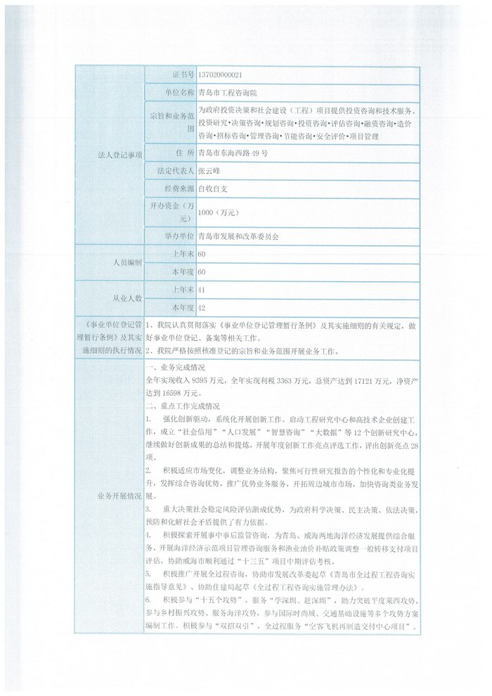 2019年,青岛市工程咨询院咨询院全年实现收入9395万元,纳税1055万元,税后利润2308万元,总资产17121万元,同比增长17%;净资产16598万元,资产保值增值率116%。