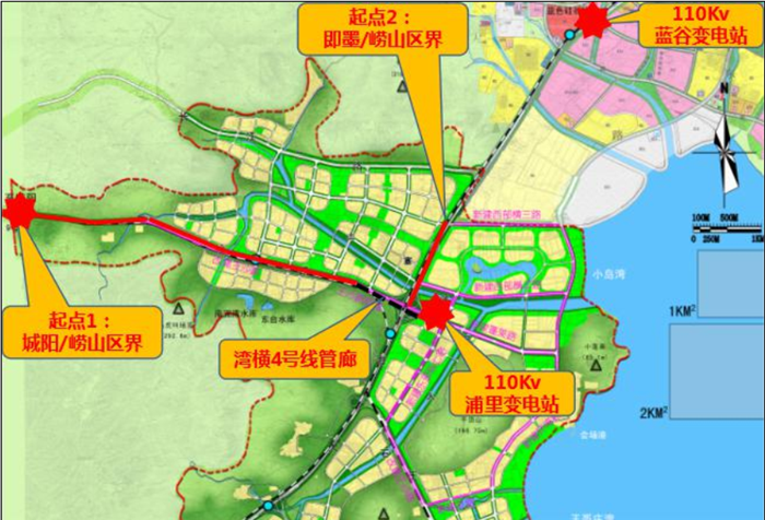 3.项目概况:浦里110千伏变电站电力管廊工程位于青岛市崂山区王哥庄街道,总长约6.3km,共分为两段,其中王沙路电力管廊西起崂山区城阳区区界,向东沿王沙路中央分隔带敷设,接至崂山区湾横4号线综合管廊,长约5km;滨海大道电力管廊北起崂山区即墨区区界,向南沿滨海大道东侧现状绿化带敷设,接至崂山区湾横4号线综合管廊,长约1.3km。项目估算总投资27744万元,预计2022年底竣工。