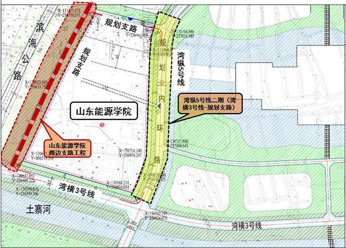 3.项目概况:山东能源学院周边支路位于青岛市崂山区王哥庄街道,规划为城市支路,南起湾横3号路,北至规划支路,全长约650米,红线宽度16米,道路西侧绿化带宽度约42米,东侧绿化带宽约22米,其中车行道12米,两侧人行道各宽2米。主要建设内容:道路、交通、给水、雨水、绿化、路灯等。项目估算总投资约8786万元,预计2022年底竣工。