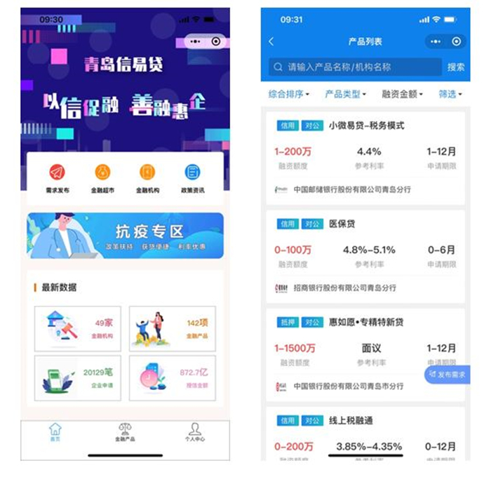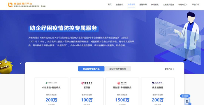 在市发展改革委与青岛银保监局联合发布《关于充分利用“信易贷”平台助力中小微企业融资应对疫情影响的通知》后,我院积极配合做好软硬件配套工作,在前期调研成果的支撑下,组织党员技术骨干攻关,仅用2天时间,在青岛信易贷平台网站及微信小程序端同时上线了“抗疫专区”板块,并进一步完善相关功能。截止3月31日,“抗疫专区”已累计发布40余个信贷产品及10余项相关金融机构支持政策。