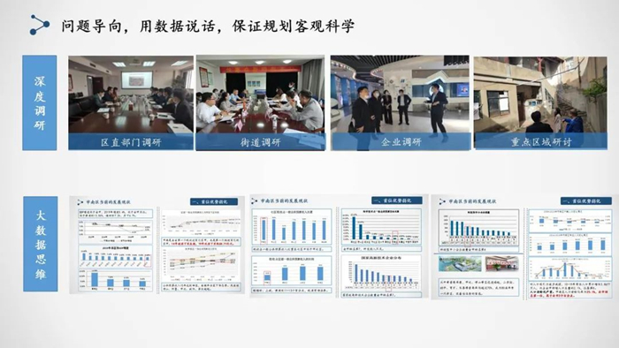 没有调研就没有发言权。规划组深入区直部门、街道、重点企业、中山路等重点区域进行现场调研,掌握了一手数据。同时借助大数据手段,对市南区的经济社会发展问题进行形象分析,为后续思路提出奠定坚实基础。