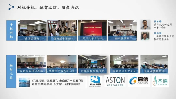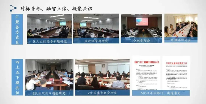 对标上海黄浦、深圳福田,规划组先后两次奔赴上海、深圳考察学习,与政府官员、专家、企业家座谈交流,实地考察重点项目;与各领域专家、市十四五规划组、市政府政研室研讨规划思路,广泛征集市民意见;多维度、多层次融集智慧为市南发展把脉。汇聚人大代表、政协委员、企业家及自媒体等社会各界意见建议。区政府2次专题会议研究规划思路,院长带队在2次区委专题会议向市南区委书记汇报规划思路,规划成稿后先后5次征求部门、街道意见,4上5下,最终逐步凝聚达成共识。