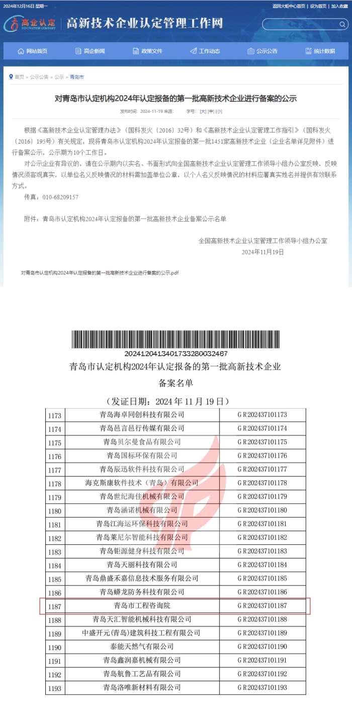 近日,全国高新技术企业认定管理工作领导小组办公室对青岛市2024年认定报备的第一批高新技术企业备案名单予以公示,我院荣列其中,再次被认定为“国家高新技术企业”。