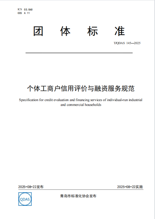 近日,由我院政务数据部、征信公司参与起草的团体标准《个体工商户信用评价与融资服务规范》(T/QDAS 145—2025)正式发布。该标准旨在破解个体工商户融资难题,通过建立科学、多维的信用评价体系,为其融资服务提供规范依据。