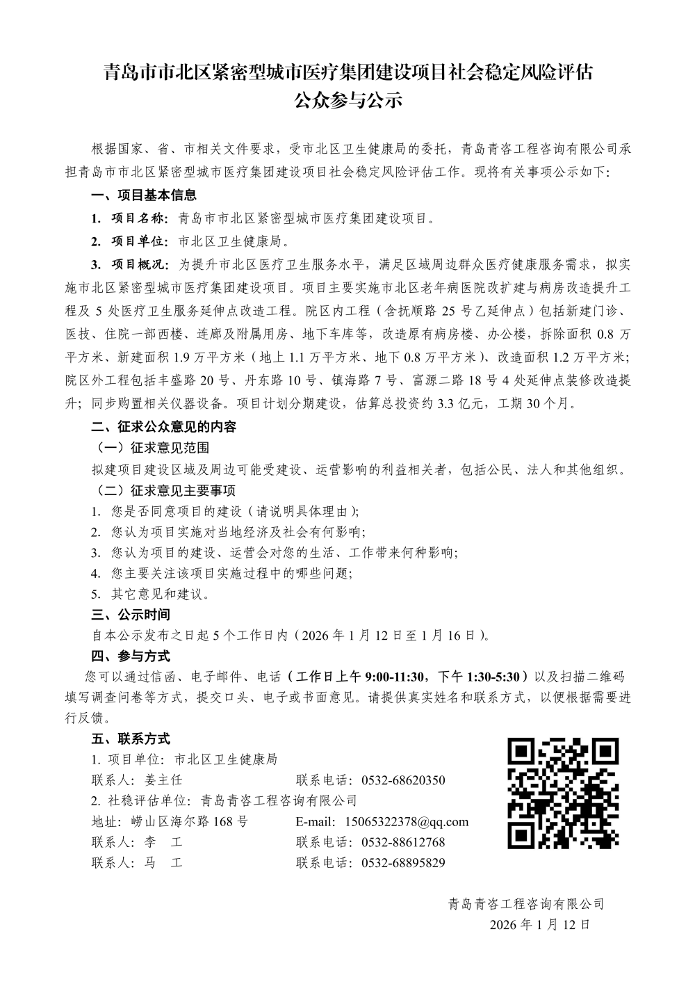 根据国家、省、市相关文件要求,受市北区卫生健康局的委托,青岛青咨工程咨询有限公司承担青岛市市北区紧密型城市医疗集团建设项目社会稳定风险评估工作。