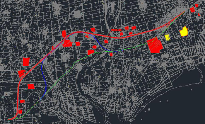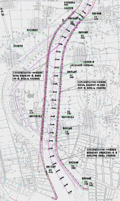 项目线路走向图(红色线为规划线位,绿色线为现状线位)