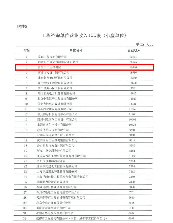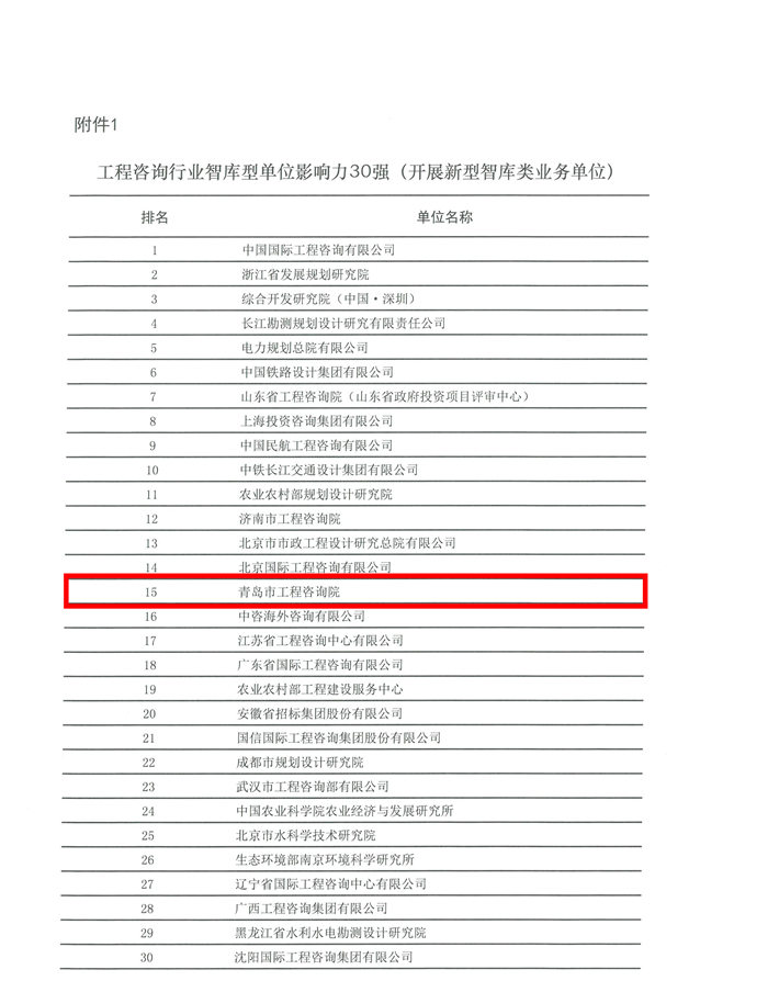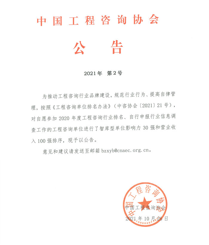 10月26日,中国工程咨询协会2021年第2号公告中正式公布了“2020年度工程咨询行业排名”,我院在小微型企业(在职员工人数<100人)营业收入排名第三,在工程咨询行业智库型单位影响力30强名单中排名15。
