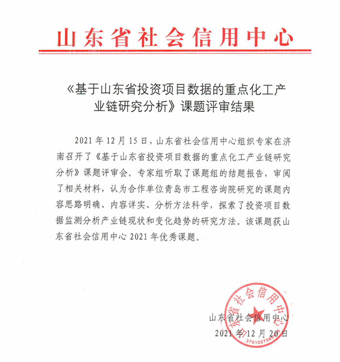 该课题以近三年山东省重点化工投资项目为数据基础,利用大数据分析技术,清洗、分析上万项目信息,实现项目数据精准落链,并从项目生产领域、重点环节拟增产能、投资项目空间布局等方面,深入分析了赋码投资项目对化工产业链影响,构建了从项目到产业链的数据分析模型,充分展现了我院的大数据分析能力。