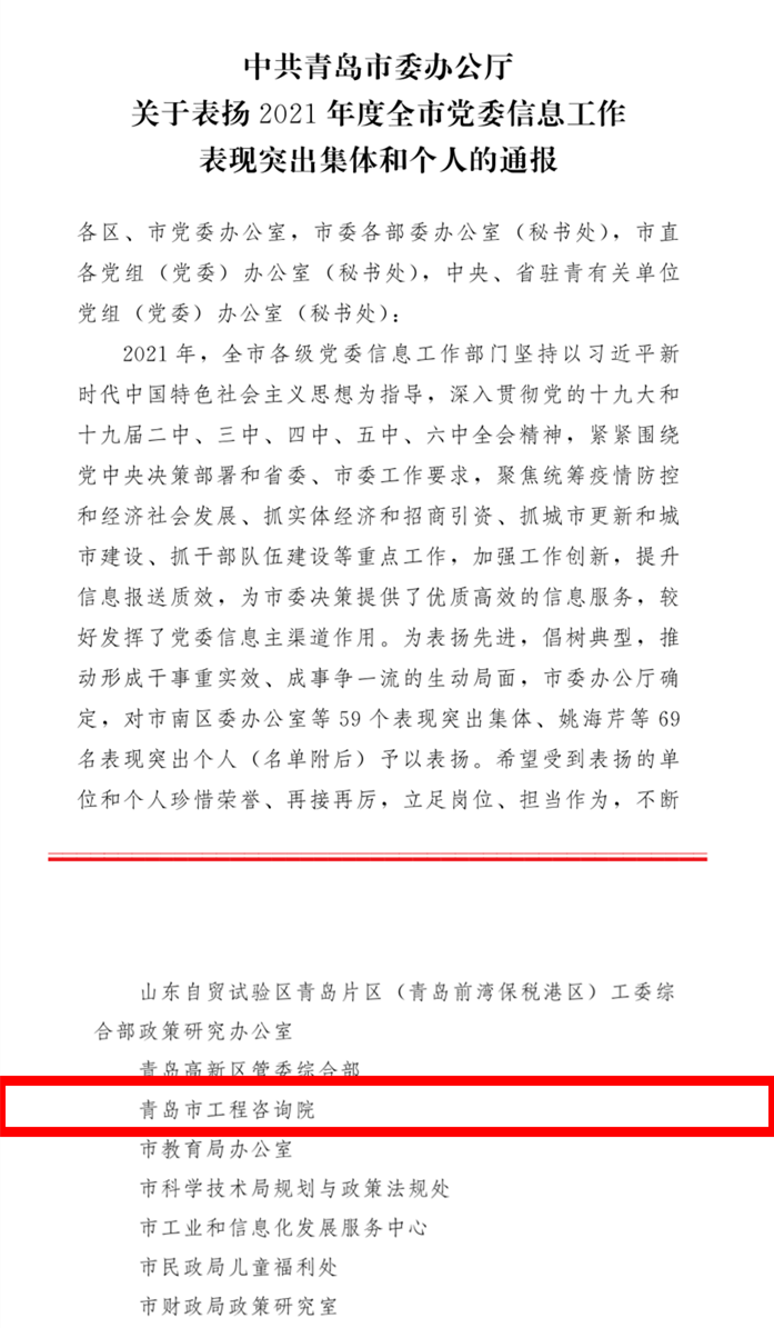 2021年,我院积极发挥智库作用,为全市经济社会发展建言献策,提供了大量优质高效的信息服务。院政策规划中心全年直接或间接向市级领导呈报研究成果或建议10余次,7项成果获市领导批示;编撰《青岛投资研究》期刊12期,向市发改委、区市发改局等10余个部门报送3300余份。院发展协调部积极向市发改委官网“发展改革工作”栏目供稿,全年发布各类新闻稿件85篇,多次考核位居委属单位前三。院办公室全年向市发改委机关党委报送党建信息68篇,在市直机关工委网站发布31篇。