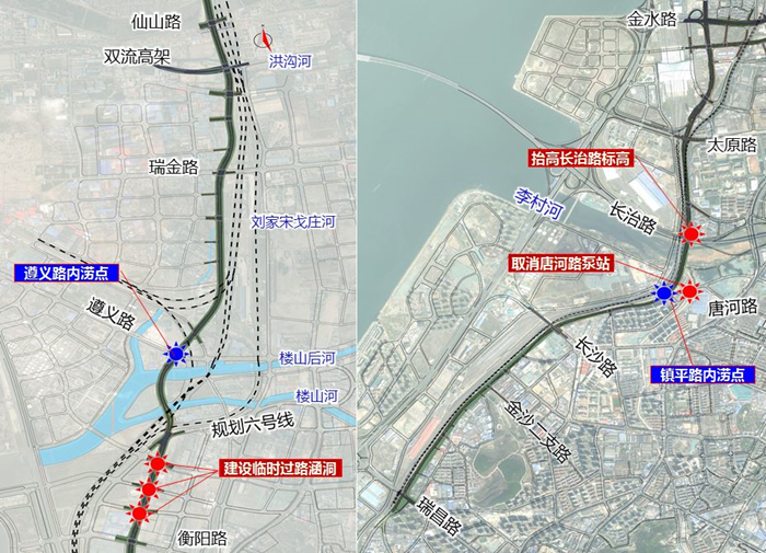﹡全面改善后海区域的内涝:评审提出建设临时过路涵洞、连通上下游排水沟、防倒灌拍门,通过抬高安顺路与长治路路口标高,将安顺路雨水从李村河河中渠上方排入李村河;一系列系统化方案极大改善了后海区域的内涝问题,并提出取消远期唐河路泵站建设等建议。