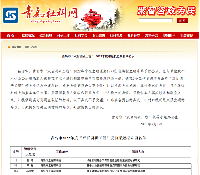 青岛市“双百调研工程”由中共青岛市委宣传部和青岛市社会科学届联合会共同组织,旨在组织全市社科工作者,加强对青岛市经济社会发展重大理论问题和现实问题的研究,更好发挥资政服务功能,为青岛高质量发展建设提供强有力的理论支撑和智力支持。(完)