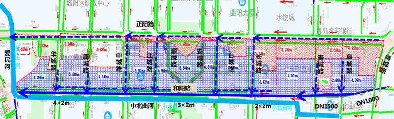 保留现状排水体系,在和阳路北侧新建雨水管渠,收集小北曲河以北,正阳路以南区域雨水,雨水由东向西排入爱民河;沿相交道路向南排入小北曲河,管线全长约2700m。