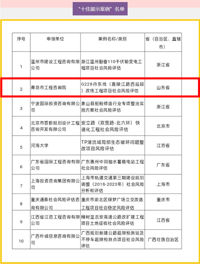 近日,由中国应急管理学会社会风险评估与治理工作委员会组织开展的第二届重大决策社会稳定风险评估与治理创新案例正式揭晓,入围案例共计56个,其中山东省7个。我院及青咨公司完成的“G228丹东线(嘉陵江路西延段)改建工程风险评估”、“《青岛市国民经济和社会发展第十四个五年规划和2035年远景目标纲要》风险评估”、“崂山区城镇老旧小区试点片区改造工程社会风险评估”、“某地铁路事业发展中心经营体制改革实施方案(草案)社会风险评估”、4个项目入选第二届风险评估与治理创新案例名单,其中“G228丹东线(嘉陵江路西延段)改建工程风险评估”项目获“十佳展示案例”, 获奖案例数量居全国咨询机构首位,彰显了我院重大决策风险评估工作的实力。