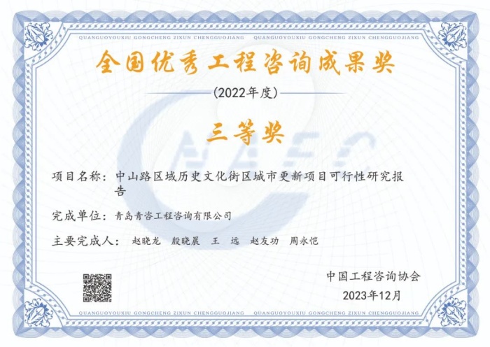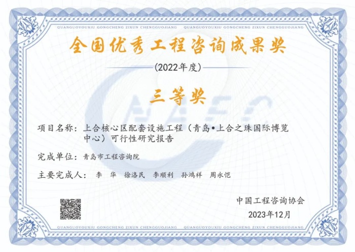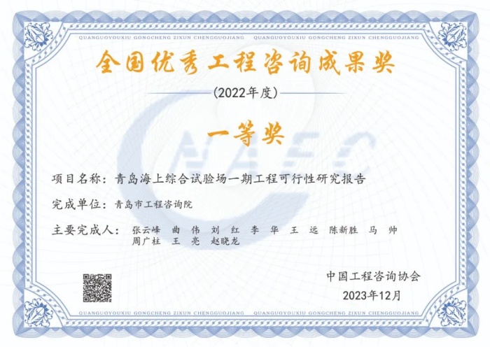 近日,中国工程咨询协会公布了《2022年度全国优秀工程咨询成果奖获奖项目名单》,我院编制的《青岛海上综合试验场一期工程可行性研究报告》荣获一等奖;《上合核心区配套设施工程(青岛·上合之珠国际博览中心)可行性研究报告》荣获三等奖。青岛青咨工程咨询有限公司编制的《中山路区域历史文化街区城市更新项目可行性研究报告》荣获三等奖。