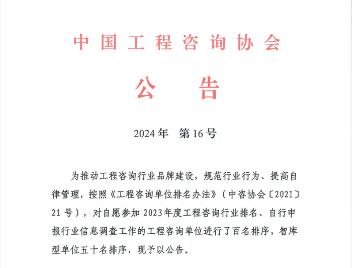 11月6日,中国工程咨询协会官网发布2024年第16号公告,正式公布“2023年度工程咨询行业排名”。我院在工程咨询行业智库型单位影响力50强中排名第13位(较2022年度前进1位),工程咨询单位营业收入100强(中型单位)排名41位。